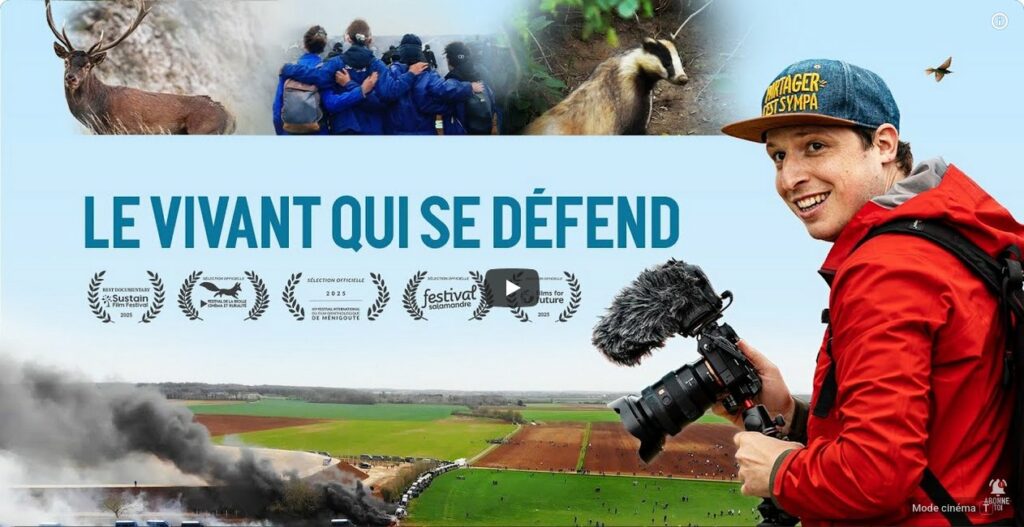 Vincent Verzat filme les mobilisations écologiques depuis 10 ans sur la chaîne YouTube Partager c’est Sympa (310k abonné·es). Partant d’un récit personnel et sensible, le film “Le vivant qui se défend” retrace son cheminement entre militantisme et naturalisme, sa recherche d’un équilibre entre combat et contemplation, traçant un chemin pour vivre dignement et affronter ce qui vient. Des luttes forestières du plateau des Millevaches à la tanière d’une famille de blaireaux, en passant par les méga bassines du Poitou, les cerfs du Vercors et l’autoroute A69, “Le vivant qui se défend” fait le lien entre les animaux sauvages et les luttes qui sont menées partout en France contre la destruction de leurs habitats. Un documentaire de Vincent Verzat (1h29), auto-produit et auto-distribué par Partager c’est Sympa, à voir ici.